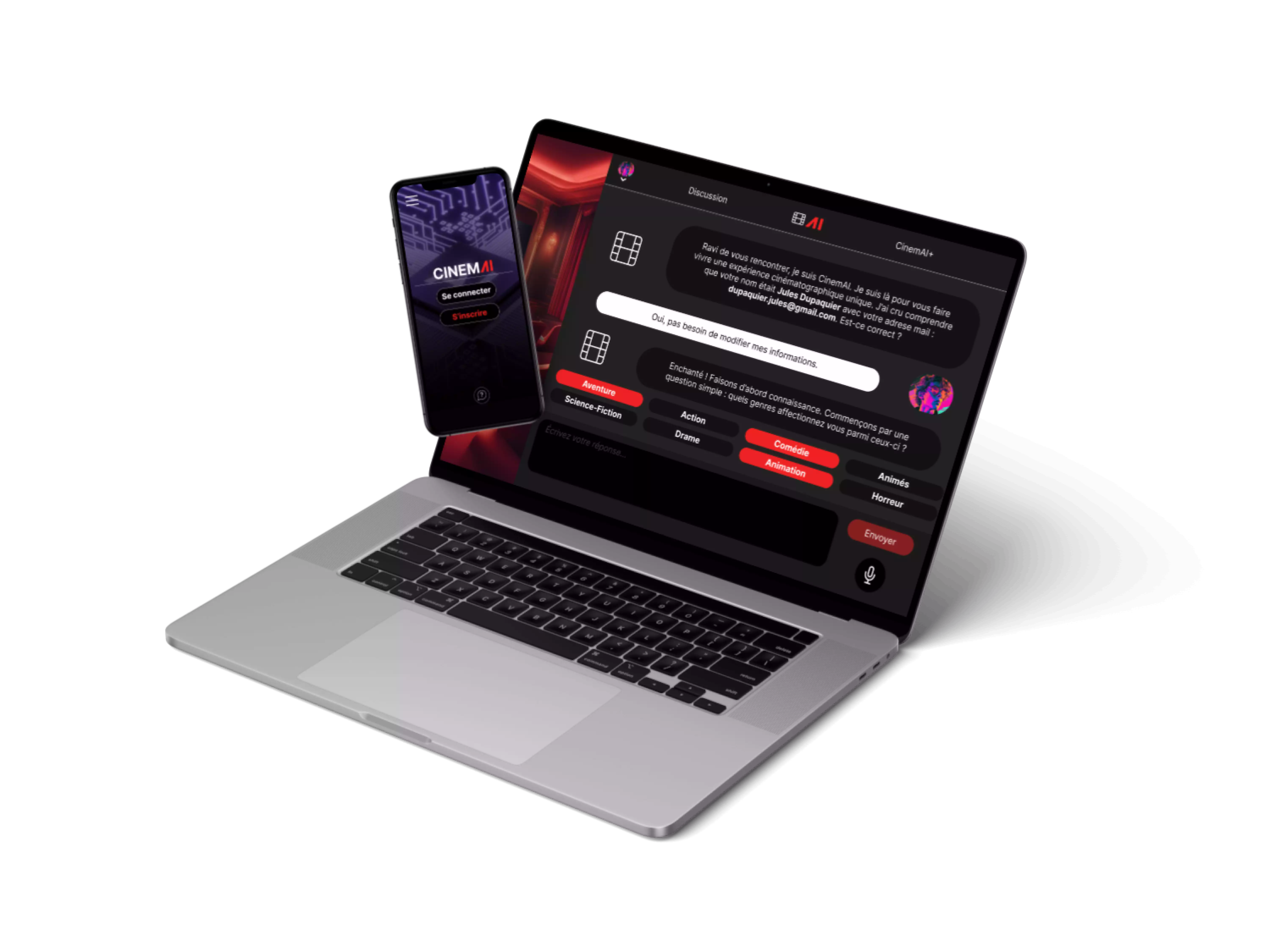 CinemAI est un projet de plateforme de streaming innovante, boostée par l’intelligence artificielle, qui révolutionne l’expérience de visionnage en ligne. Celui-cia été imaginé en collaboration avec Dany Galmiche. Grâce à l’IA, CinemAI propose des recommandations personnalisées de films et séries, une navigation intelligente et une découverte de contenus adaptée aux préférences de chaque utilisateur. L'objectif de CinemAI serait de proposer de meilleures recommandations du cinéma et des séries au spectateurs en toute simplicité.